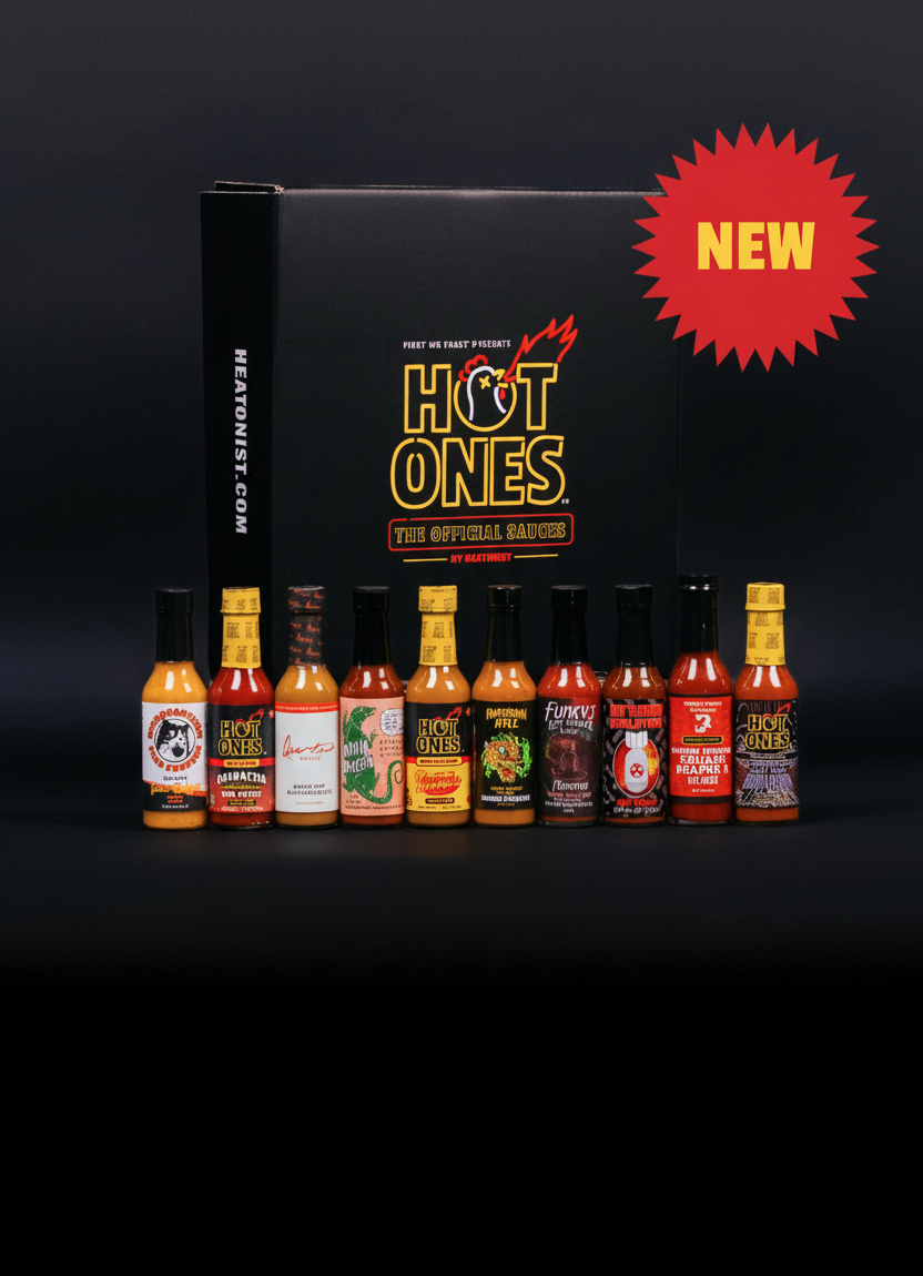 Take home the full Hot Ones hot sauce lineup from Season 29 with 10 sauces, heat guide, and stickers in a custom Hot Ones gift box. Bring the heat to any party or host your own challenge & make memories!